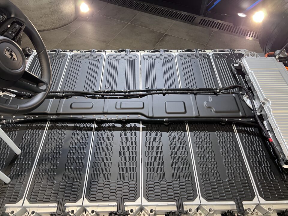 Schnellladefähig ist die Batterie bereits ab 15 °C. Für die perfekte Temperatur sorgen Kühlflächen auf der Unter- und Oberseite der Module. Dabei durchfließt das Kühlmittel das Modul von der Beifahrerseite kommend in geraden Bahnen. Ab der Hälfte ist die Flüssigkeit bereits wärmer geworden. Darum verästeln sich die Kanäle auf der Fahrerseite stärker. Damit durchfließt das Kühlmittel eine größere Fläche.